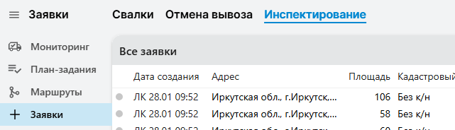 Раздел "Заявки - Инспектирование" доступен пользователям с ролью Инспектор объектов