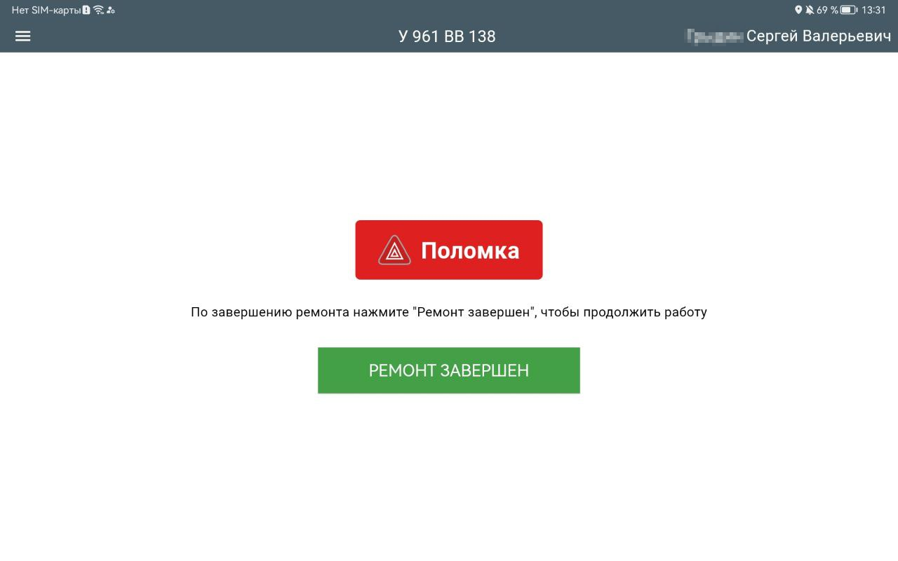 Чтобы продолжить работу с приложением, водитель должен подтвердить окончание ремонта — для этого нужно нажать кнопку «Ремонт завершён».