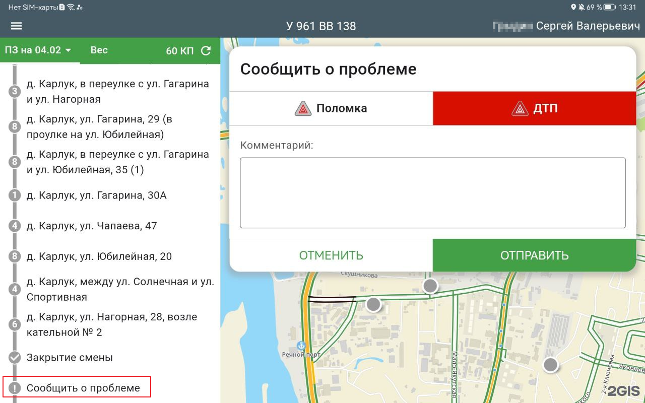 В случае поломки или ДТП транспортного средства необходимо зафиксировать информацию о происшествии в приложении. Для этого в план‑задание добавлен заключительный пункт «Сообщить о проблеме».