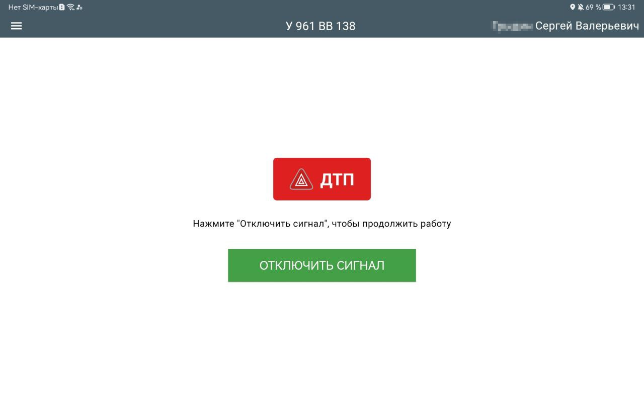 Чтобы возобновить работу с приложением после фиксации ДТП, водитель должен нажать кнопку «Отключить сигнал».