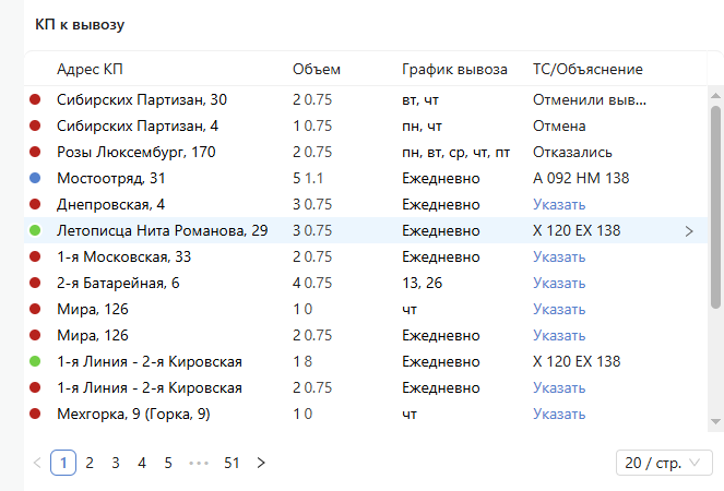 В Редактор ПЗ добавляется новая вкладка КП к вывозу. Раздел показывает КГ, вывоз которых запланирован на указанное в шапке число, и которые при этом не были поставлены ни в одно из существующих ПЗ на это число
