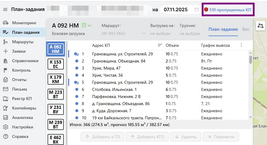 Пропущенной считается КГ, которая одновременно не поставлена в ПЗ и не указано объяснение. Если число пропущенных КГ по всем участкам перевозчика больше нуля, в заголовке показывается ссылка-предупреждение: