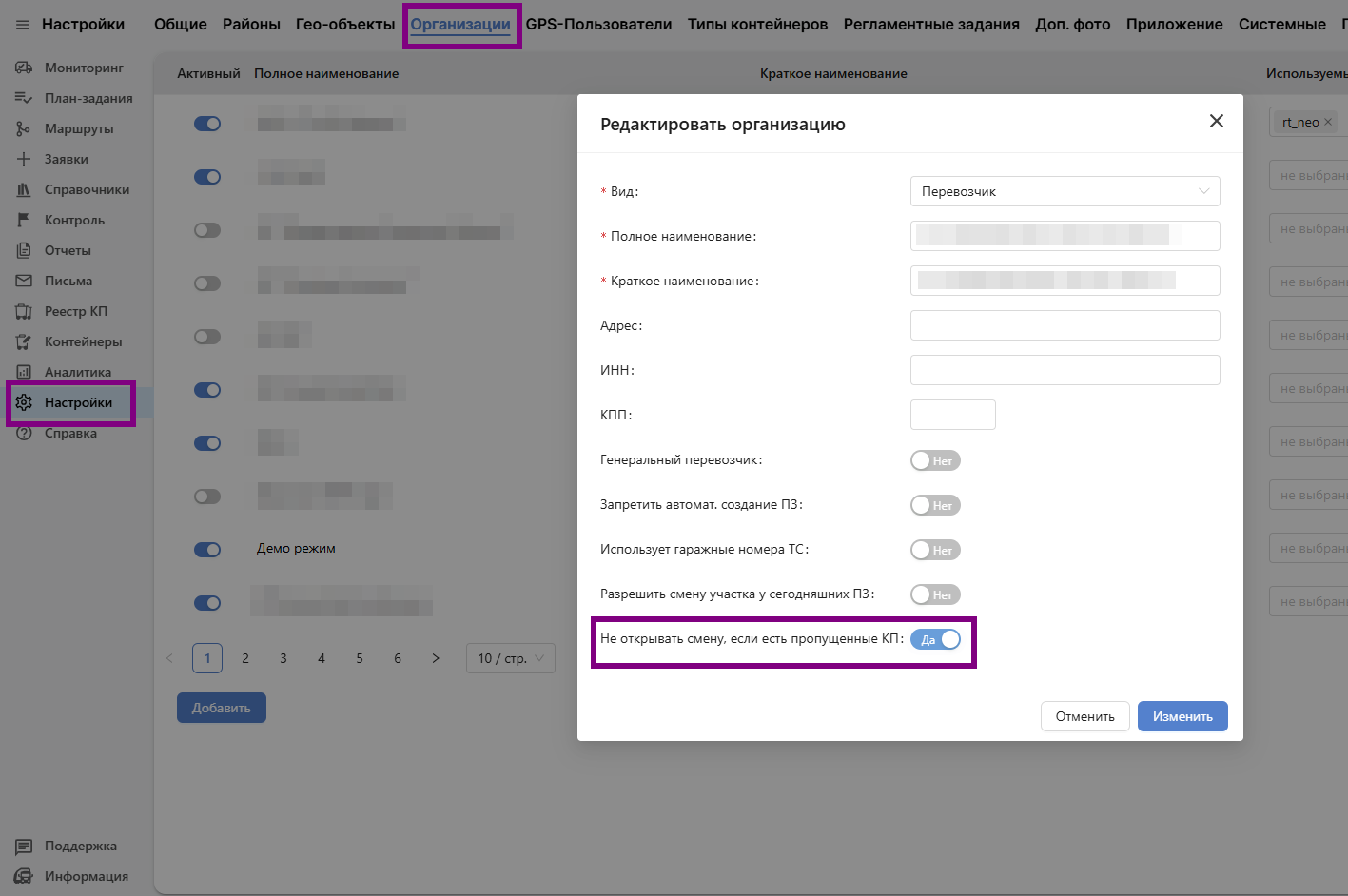 В разделе Настройки -> Организации в карточке перевозчика добавляется свойство Не открывать смену, если есть пропущенные КП