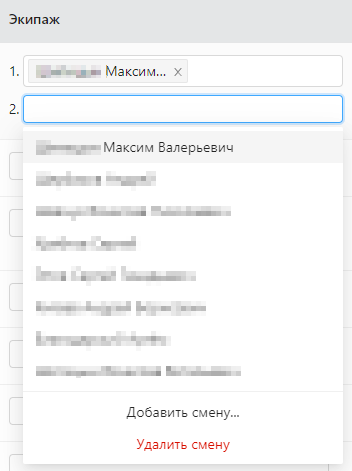 Когда смен более одной в списке выбора водителей экипажа появляется пункт "Удалить смену".
