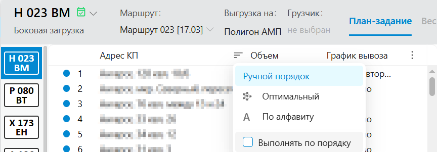 Если выбрана сортировка «По порядку выполнения», водитель может выполнять отмеченные план-задания только последовательно — от первой КП до последней.