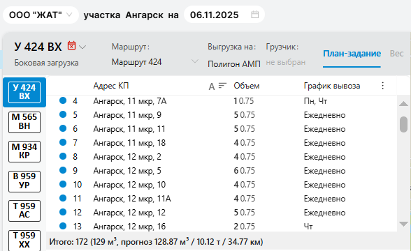 Чтобы изменить участок план-задания, в редакторе план-заданий выберите дату, перевозчика и ТС. Нажмите троеточие и выберите «Изменить участок план-задания». Откроется список доступных участков. После выбора участка план-задание обновится на новый участок, ТС останется прежним.