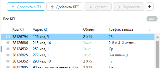 Чтобы добавить КП в план-задание, выберите ее в нижней таблице и нажмите "Добавить в план-задание". Используйте поиск по адресу или коду КП в области фильтров, чтобы найти КП.