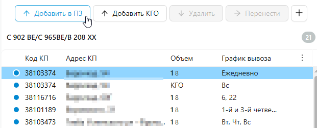 Чтобы добавить КП в план-задание, выберите ее в нижней таблице и нажмите "Добавить в план-задание". Используйте поиск по адресу или коду КП в области фильтров, чтобы найти КП.