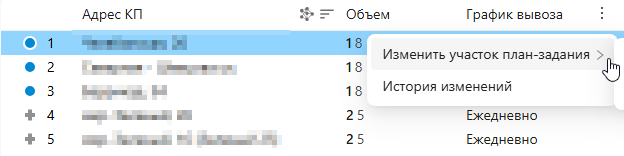 Чтобы изменить участок план-задания, в редакторе план-заданий выберите дату, перевозчика и ТС. Нажмите троеточие и выберите «Изменить участок план-задания». Откроется список доступных участков. После выбора участка план-задание обновится на новый участок, ТС останется прежним.