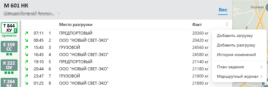 На вкладке "Вес" в Мониторинге также, как и в редакторе план-заданий, можно добавить удалить загрузку/разгрузку.