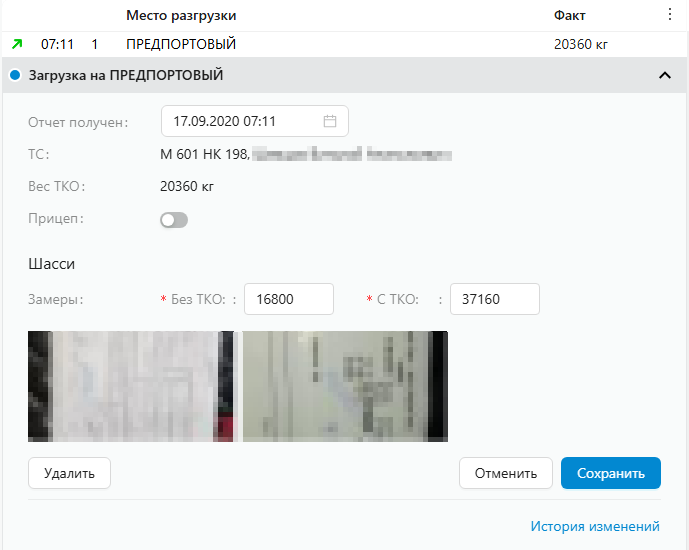 Отчеты о загрузке/разгрузке, который формирует водитель в мобильном приложении, содержат вес с ТКО / без ТКО. При необходимости выбранные значения можно скорректировать.