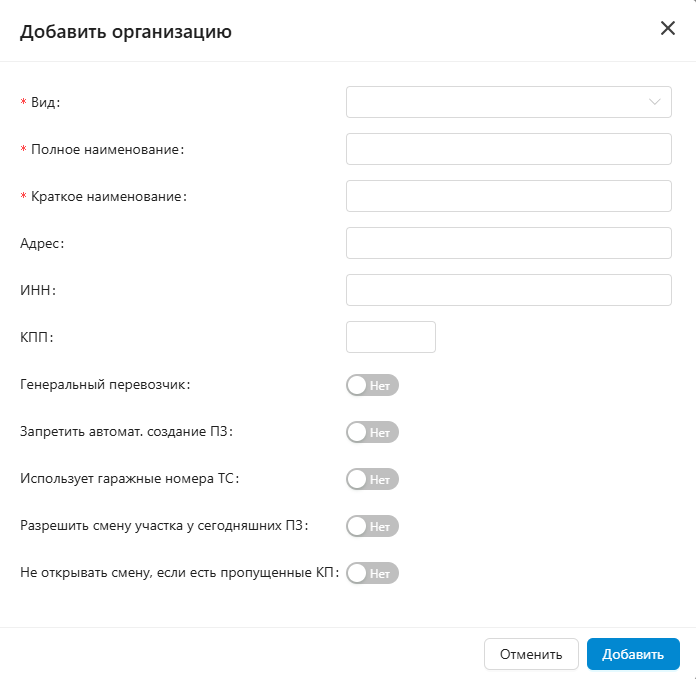 Чтобы создать нового перевозчика нажмите "Добавить", откроется меню создания перевозчика.