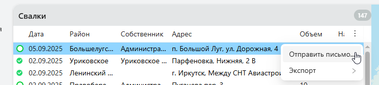 Для отправки письма отметьте нужную свалку и выберете команду “отправить письмо”