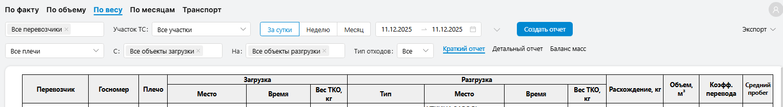 Отчет отражает загрузки и разгрузки ТС на местах хранения ТКО и включает название полигона, время и вес загрузки либо разгрузки.