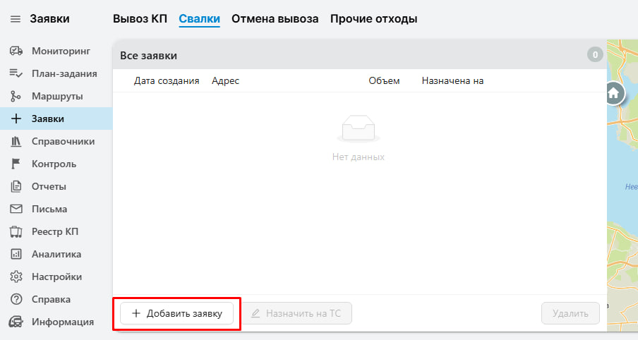 Для добавления новой заявки на вывоз свалки нажмите кнопку "Добавить заявку" в разделе Заявки - Свалки.