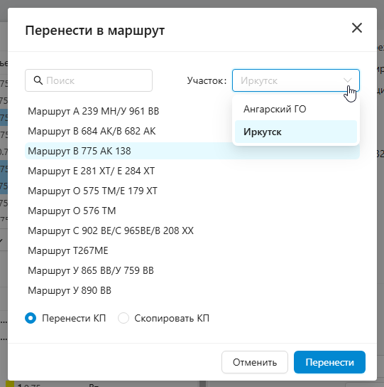 В окне переноса выберите необходимый участок, маршрут и нажмите Перенести КП или Скопировать КП