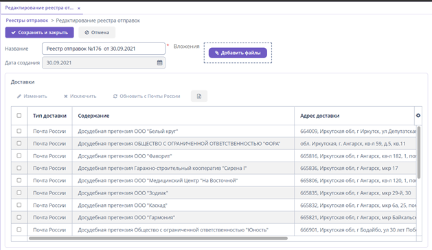 В редактировании реестра можно поменять наименование реестра, добавить файлы и изменить доставки (либо исключить их).