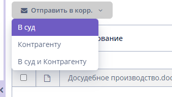 При добавлении нового документа (или необходимости отправить старый) необходимо выделить документ(-ы) и нажать кнопку «Отправить в корр» и выбрать кому вы отправляете доставку суду, контрагенту или обоим.