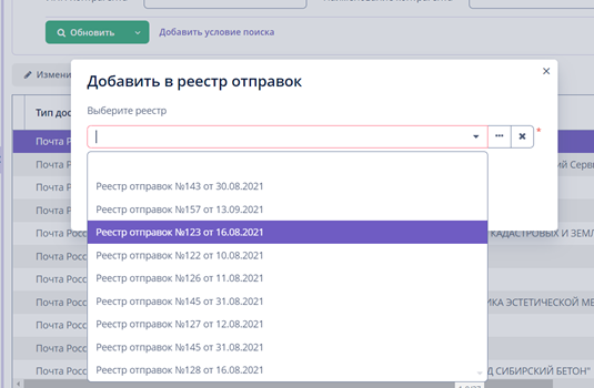 Далее необходимо добавить в реестр отправок с помощью выделения доставок и нажатия кнопки «Добавить в реестр». При добавке в реестр можно будет выбрать только тот реестр, который соответствует способу доставки и типу адресата.