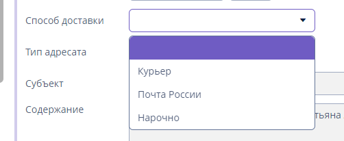 В «Доставки» вы проверяете документ еще раз, ставите тип адресата, способ доставки.