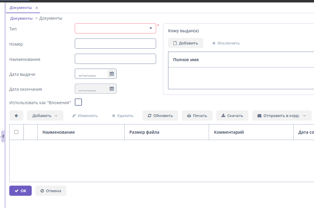 - Кому выдана - добавьте сотрудника, если это его личный документ;