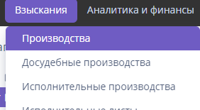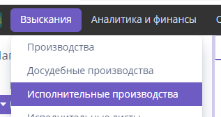 - Найти исполнительное производство можно в "взыскания"-"исполнительные производства";
