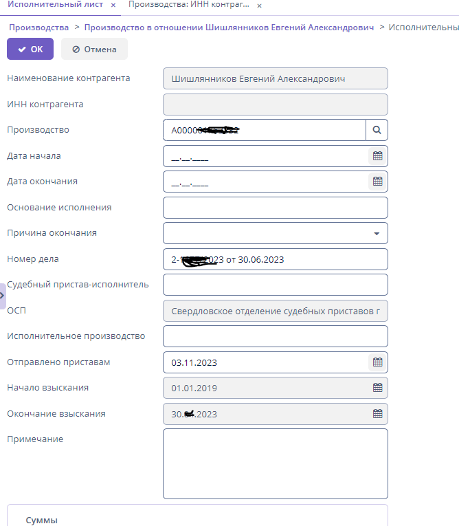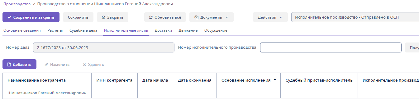 - Нажмите "создать", введите все данные, которые имеете по исполнительному листу (номер ИП подтянется в основную вкладку самостоятельно).
