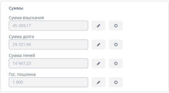 - Сумма взыскания - это та сумма, которую суд счел необходимым к выплате, вы можете ее изменить, если суд уменьшил требования;