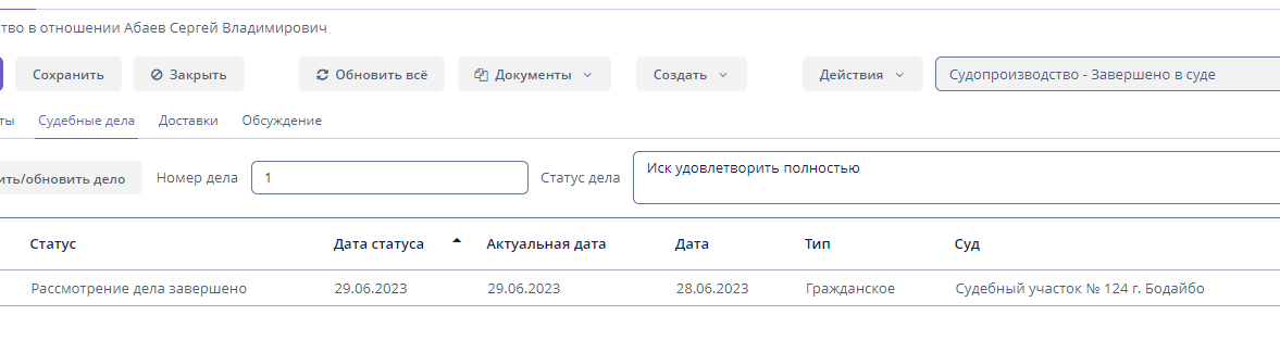 Необходимо заполнить вкладку "Судебные дела", поставить статус дела "Иск удовлетворить полность.";