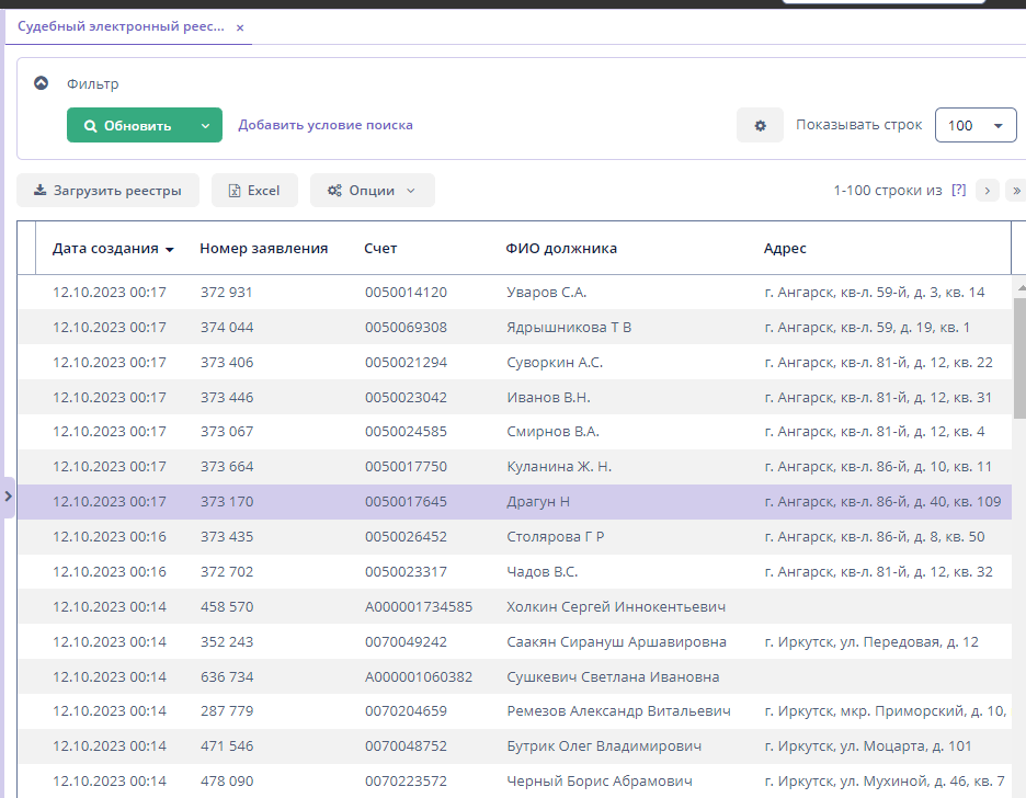 Данный реестр предназначен для загрузки реестров из суда, по кнопке "Загрузить реестры":
