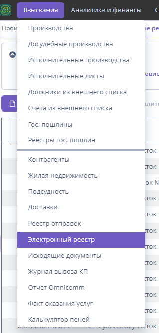 Электронный реестр находится в "Взыскания" - "Электронный реестр"