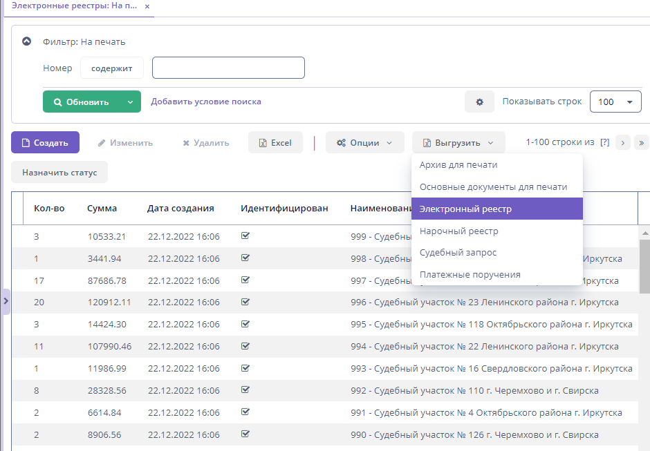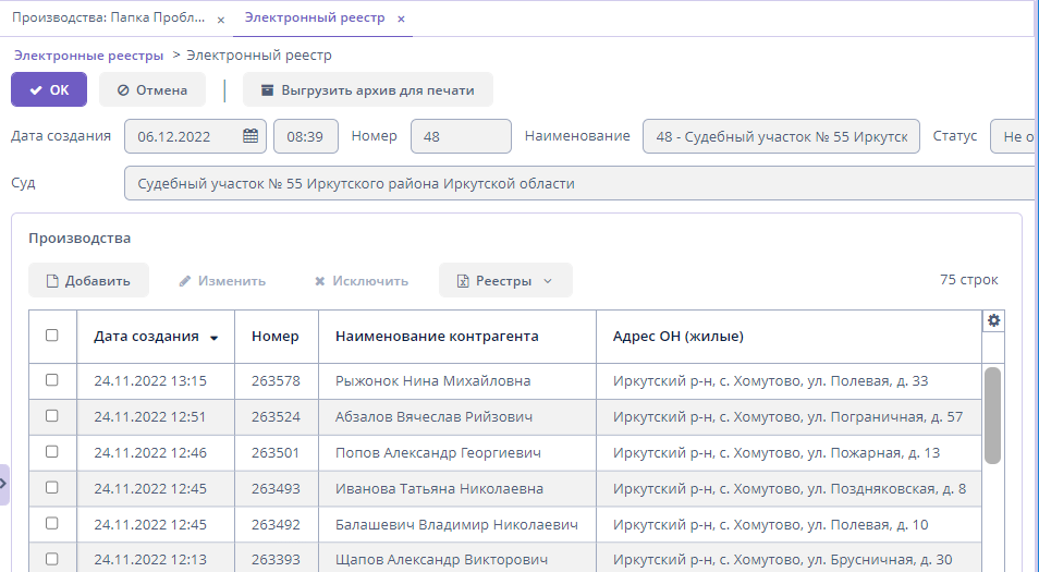 После "Оплата ЗНФ" производства автоматически попадают в папку "В печать", там необходимо выбрать нужные производства и через действия "Создать реестр в суд". При попадании в ЭР образуется несколько реестров, в зависимости от суда.