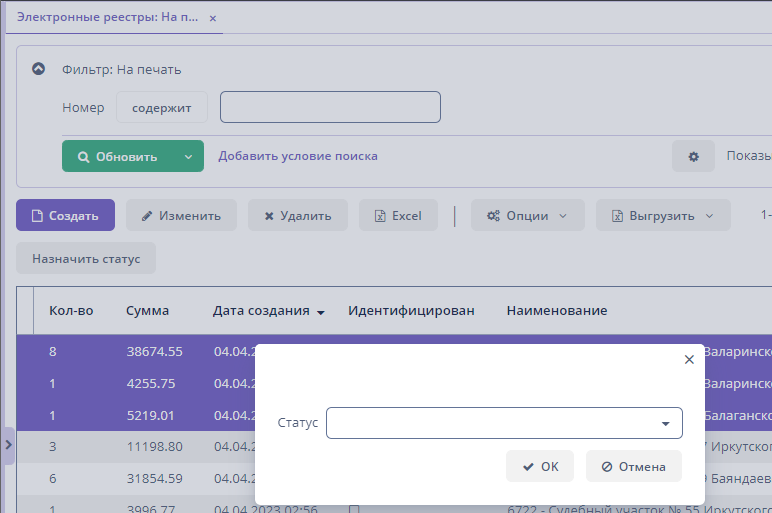 Когда, подходит курьер, чтобы забрать документы, нужно выделить нужные реестры и поставить статус (Нажмите "Назначить статус") "Отправлен нарочно", тогда этап и статус из "печати" уйдет "Передано в суд".