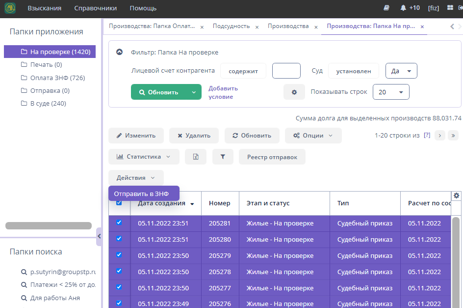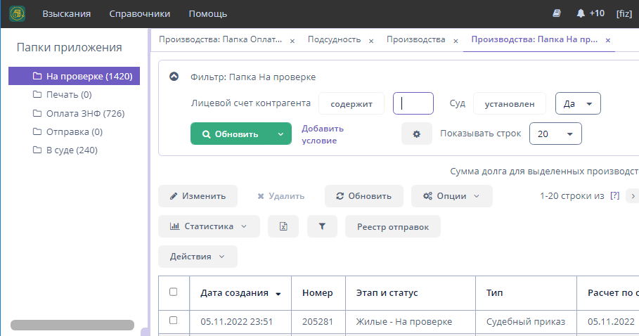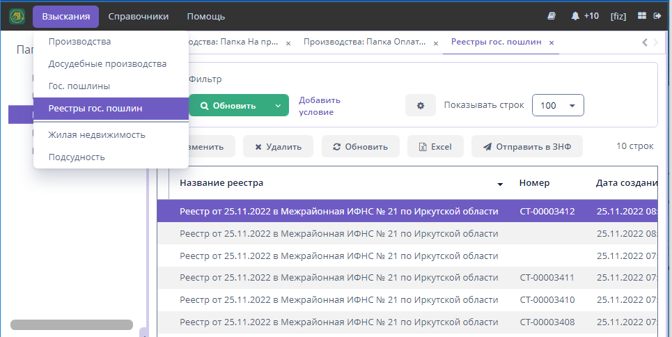 В вкладке "Реестр гос. пошлин" производства сами распределятся по необходимым судам. Вы можете проверить информацию о контрагентах нажав на реестр. Отправка в приложение ЗНФ происходит автоматически. Внутри реестра можно отследить статус.