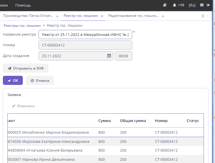 Вкладка "Госпошлины" содержит единичные записи о всех отправленных в ЗНФ контрагентах. Там можно посмотреть статус, или поменять контрагента на другого(других) через кнопку "Удалить", далее "добавить". Делается в случае, если госпошлина оплачена, а контрагенту уже не требуется.