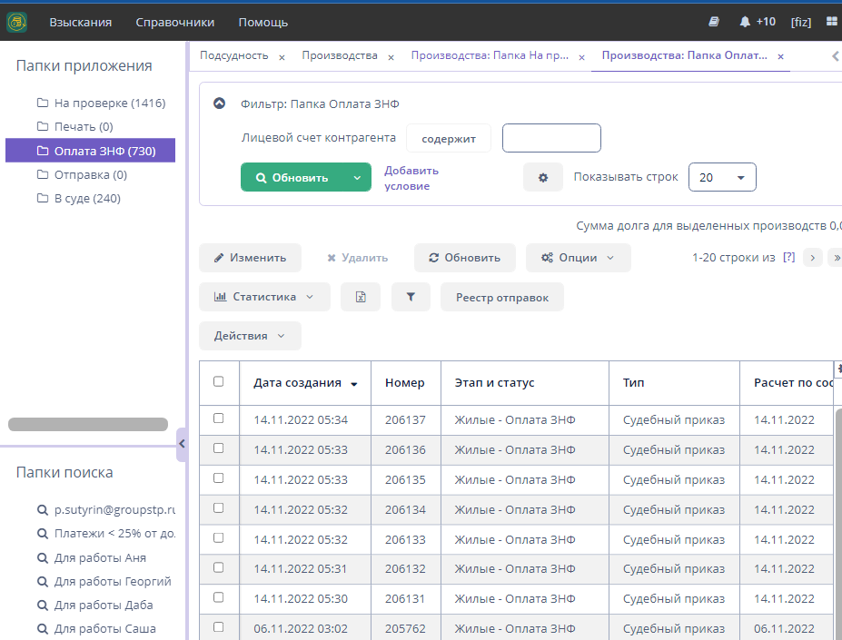 Ваши производства отобразятся в папке "Оплата ЗНФ",а также во вкладках "Реестр гос. пошлин" и "Гос. пошлины".