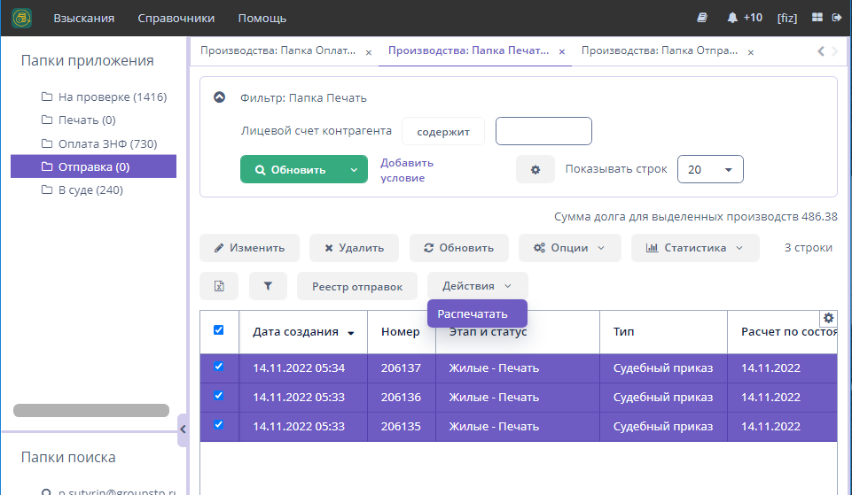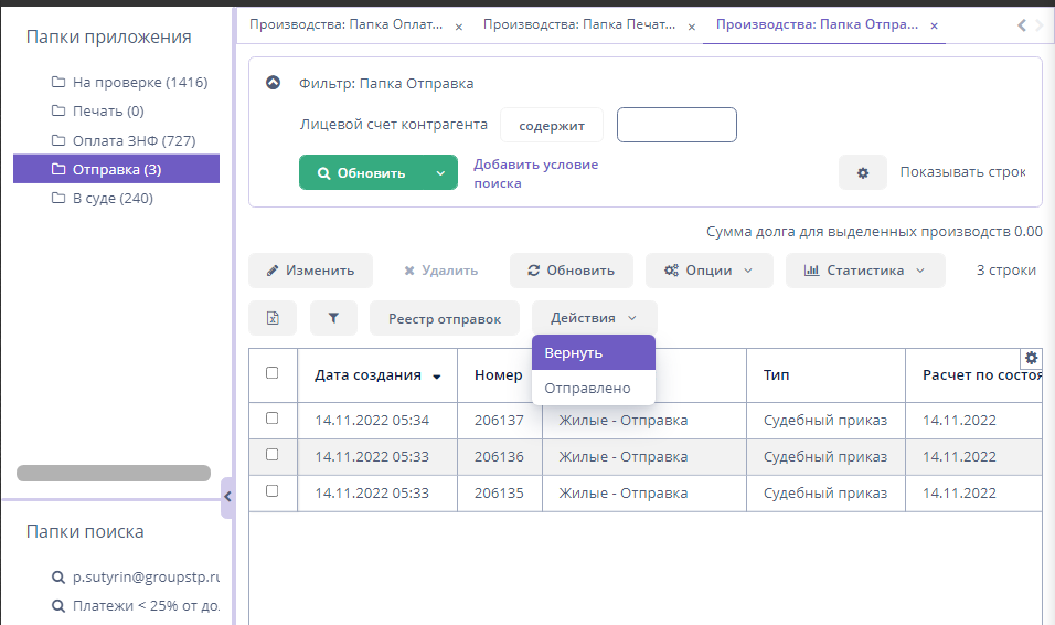 В папке "Отправка" выделите необходимые производства, которые уже были доставлены в суд и нажмите "Действия" - "Отправлено" они попадут в папку "В суде". Если производства не были доставлены и случились какие-либо проблемы, то нажмите "Действия" - "Вернуть", производство вернется в папку "Печать".