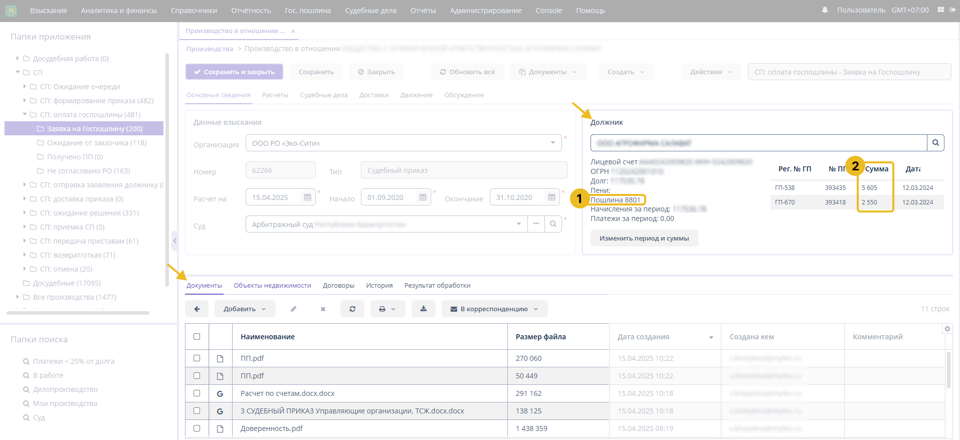 - в производстве есть информация о ГП. Это отображается в блоках "Документы" и "Должник" соответственно.