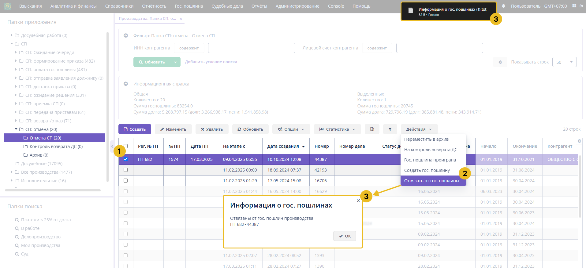 - Нажмите на кнопку Действия > Отвязать от госпошлины.