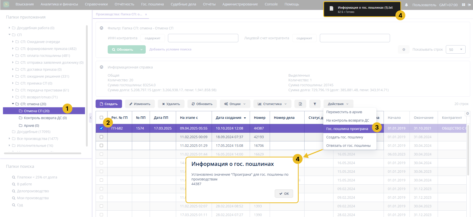 - Нажмите на кнопку Действие > Госпошлина проиграна.