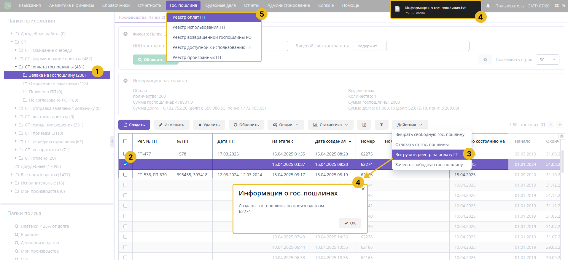 - Выгружается реестр на оплату ГП. Дождитесь системного уведомления. Закройте его.