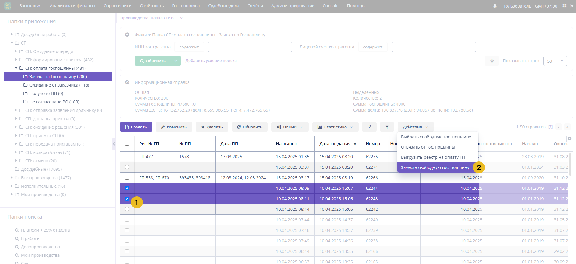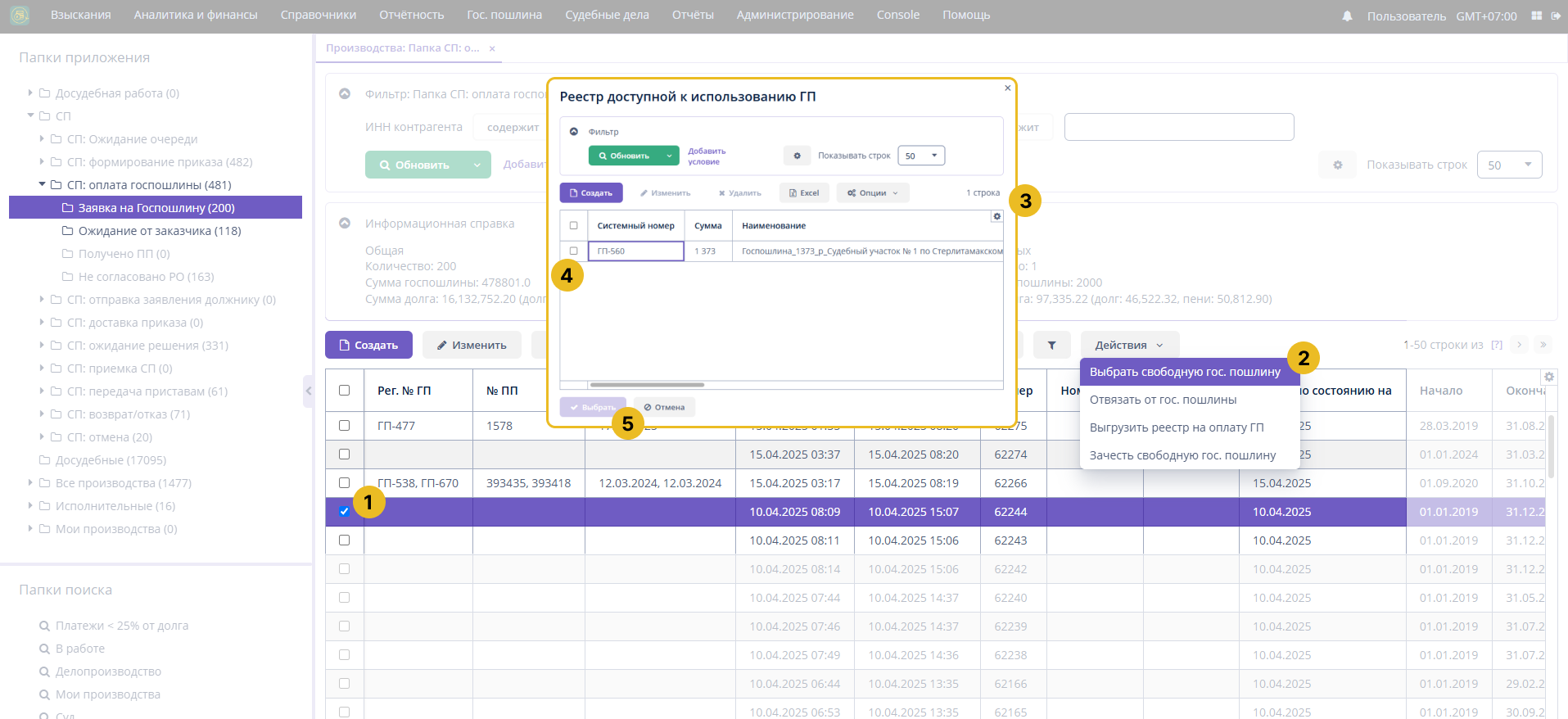 - Нажмите на кнопку Действия > Выбрать свободную госпошлину (можно только для одного производства)