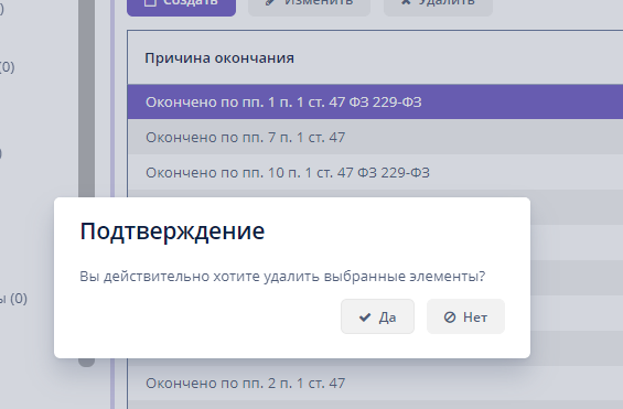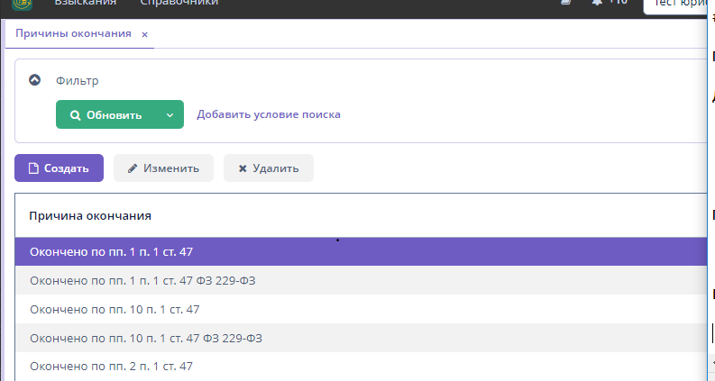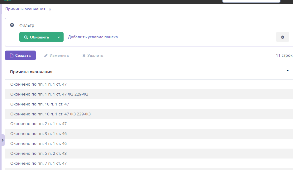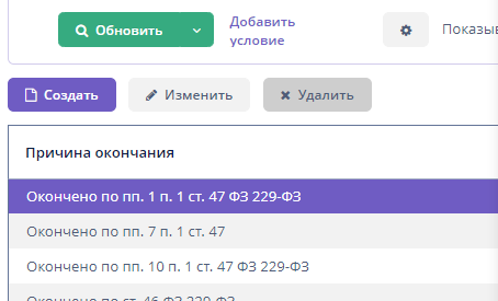 Для того, чтобы создать/изменить/удалить причину необходимо зайти в "Справочники" - "Причины окончания".