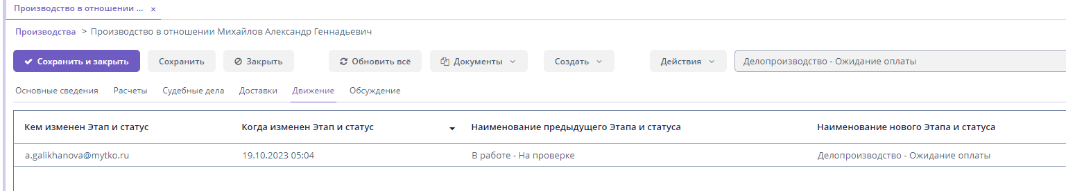 Историю статусов можно посмотреть в Производстве на вкладке "Движение":