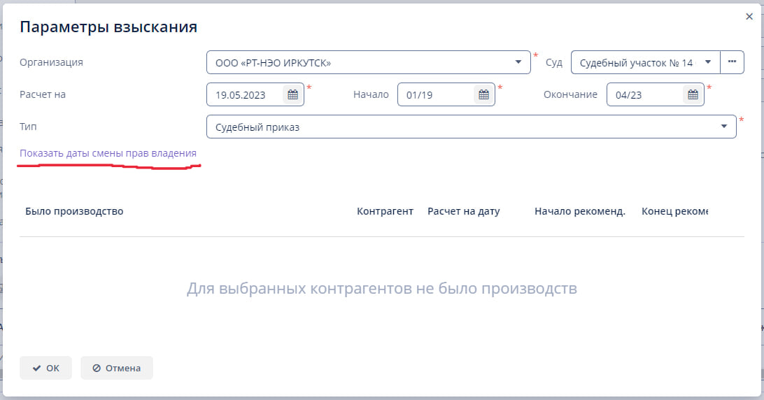 При создании производства можно посмотреть актуальный период владения данным ОН: