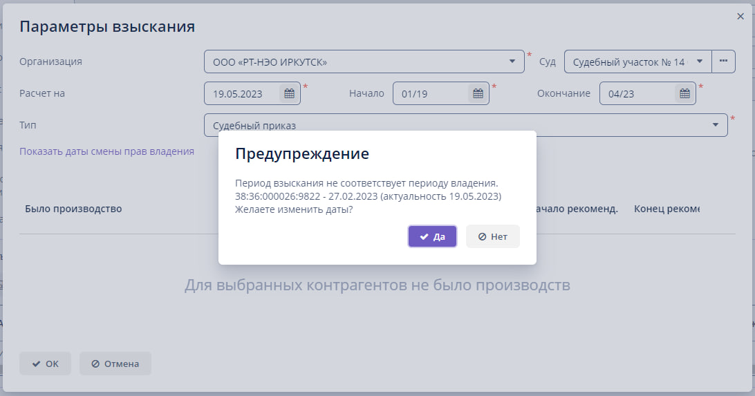 Если вы не поменяли даты, то вылезет предупреждение, нажав "Нет" - вы создадите производство с теми датами, которые указали ранее: