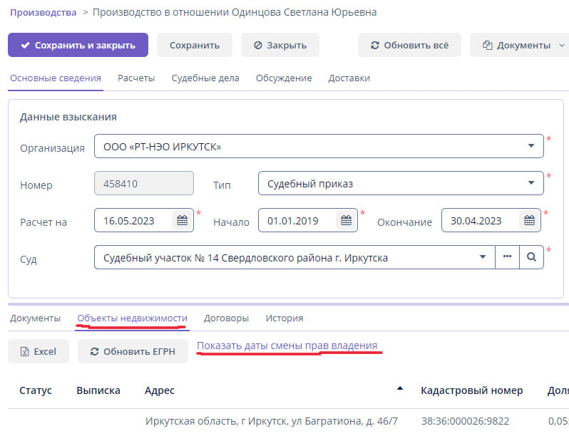 В экране производства вы можете видеть даты периода владения на карточке "Объекты недвижимости":