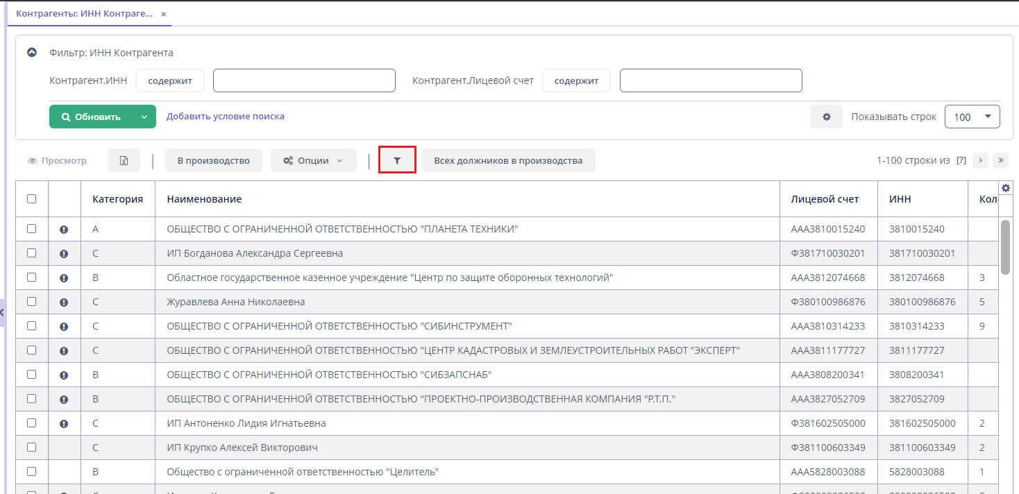 Выберите необходимых контрагентов, с помощью массового фильтра