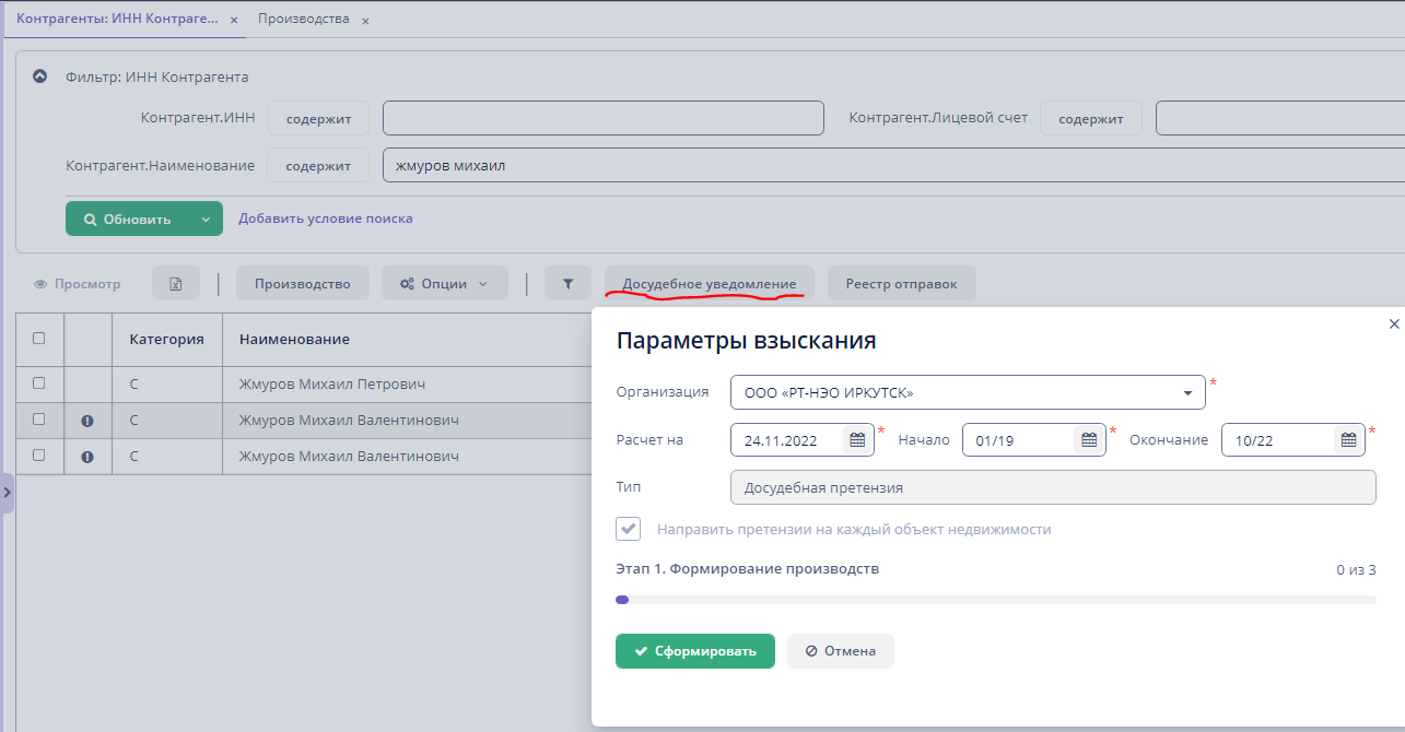Вернитесь на свою вкладку и отправьте их на формирование, с помощью кнопки "Досудебное уведомление". Выберите необходимые параметры взыскания ("расчет по состоянию на", "начало", "окончание") для досудебных претензий