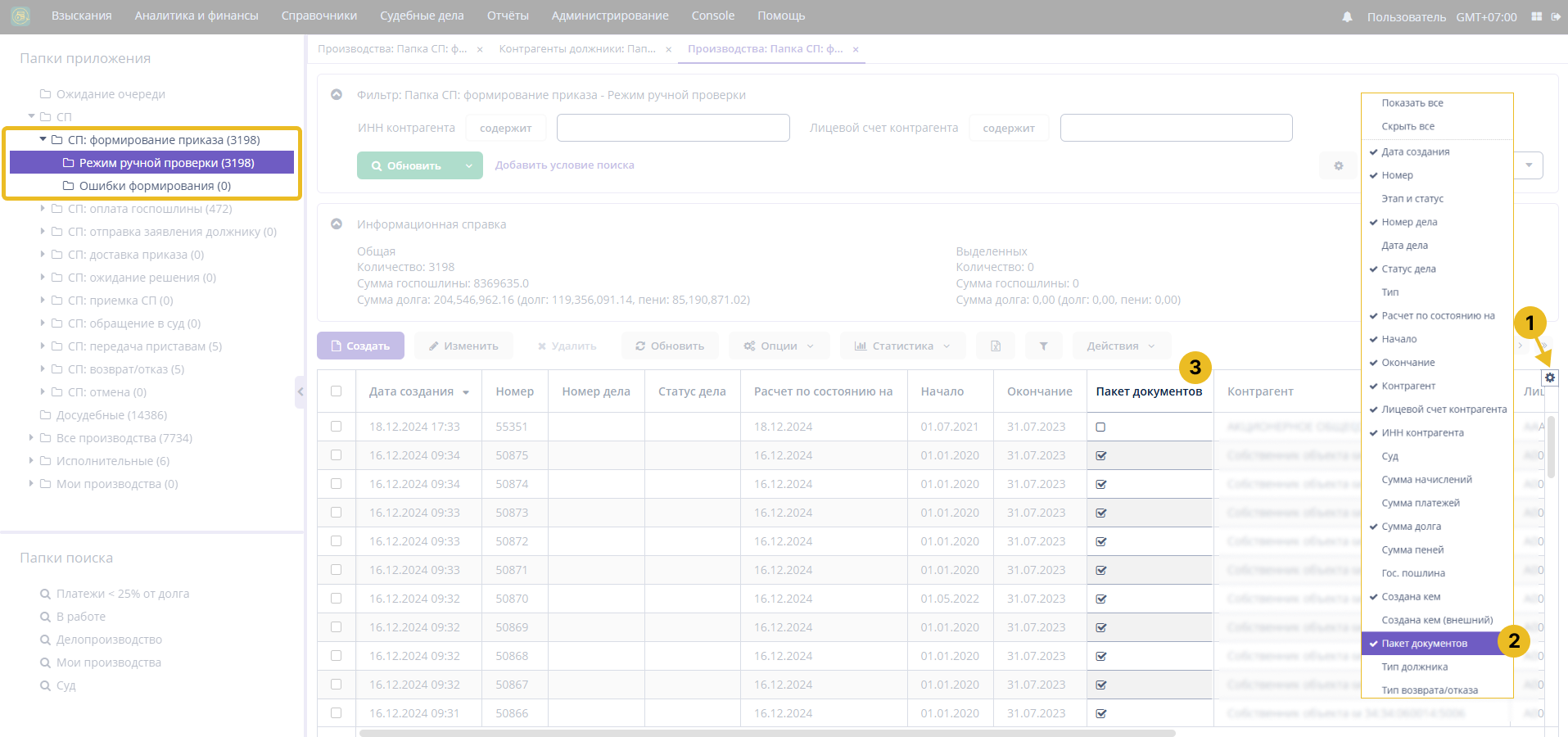 Если в колонке “Пакет документов” знак отсутствует - пакет документов сформирован не полностью, и нужно вручную добавить недостающие документы.